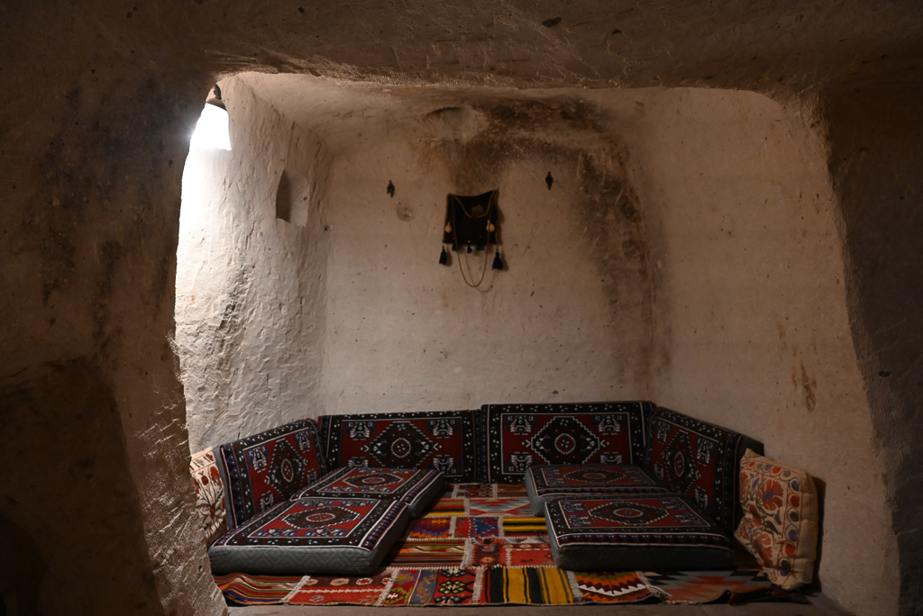 We checked into our cave hotel, one of the many accommodations carved directly into the soft volcanic rock that defines the region. The rooms were built into the hillside, giving the feeling of stepping into one of the ancient dwellings that people have used here for centuries.