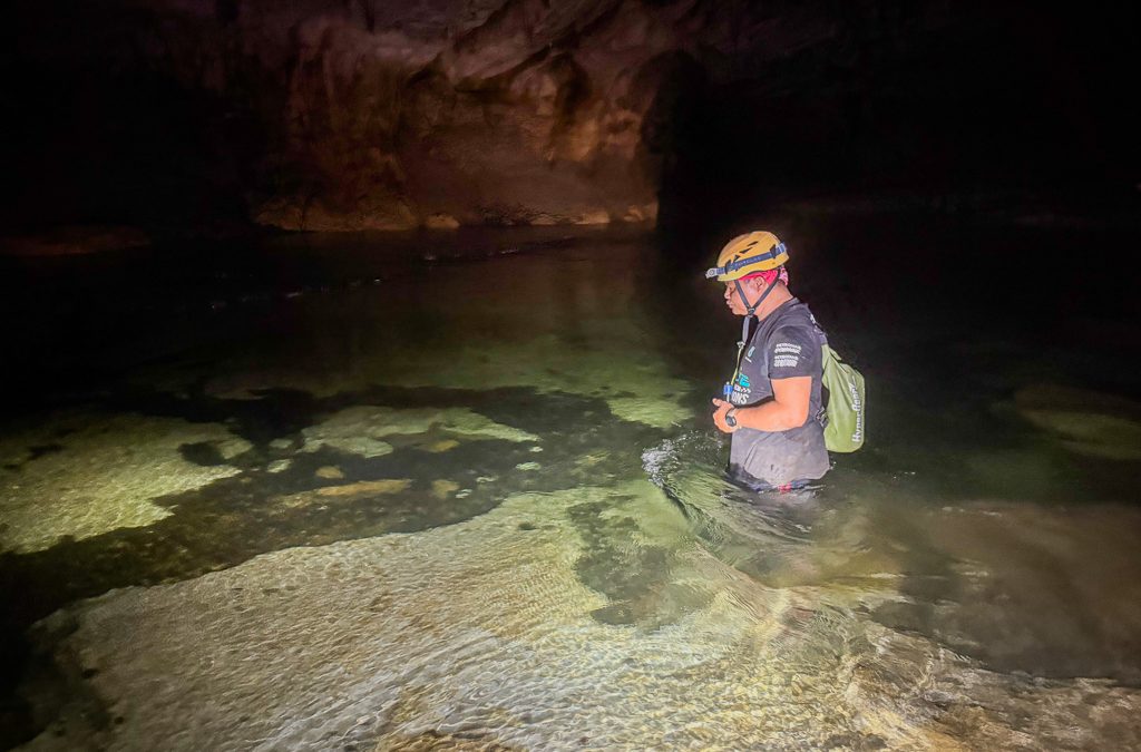 We waded in immediately, letting the cold water wash away the exhaustion and humidity of the previous hours. But the journey wasn’t over. We still had more than an hour of caving left, following the river downstream toward the exit. At times we could walk along the banks, but often the path disappeared and we had to swim across deep sections of the river, keeping our dry bags above the surface.