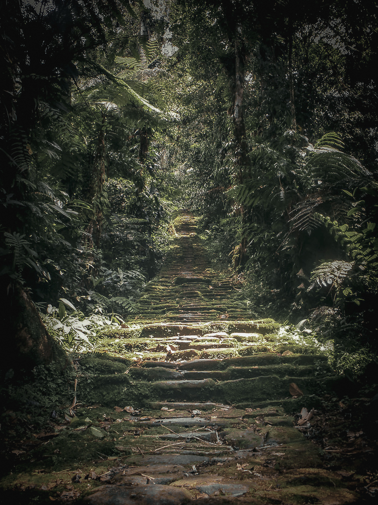 At one point, after crossing a river, our guide led us into the jungle and pointed to something barely visible in the foliage—a hidden stone staircase, emerging seemingly from nowhere, disappearing into the dense green canopy above. It was a surreal sight. The ancient stairway, 1,200 steps in total, led straight to the Lost City, perched atop a rainforest-covered mountain.