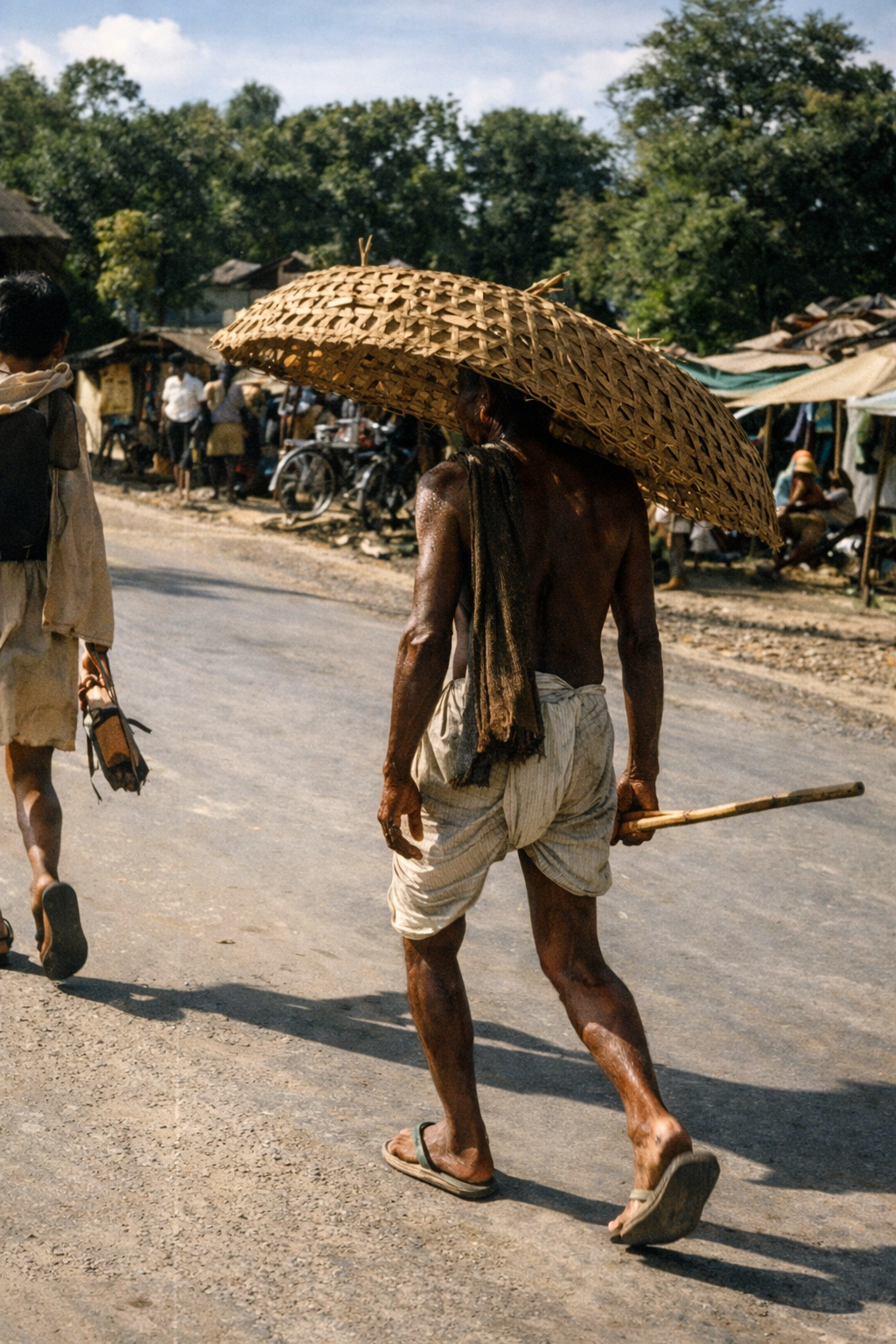 Man with a huge bamboo hat in a random village a traditional woven sun umbrella / parasol