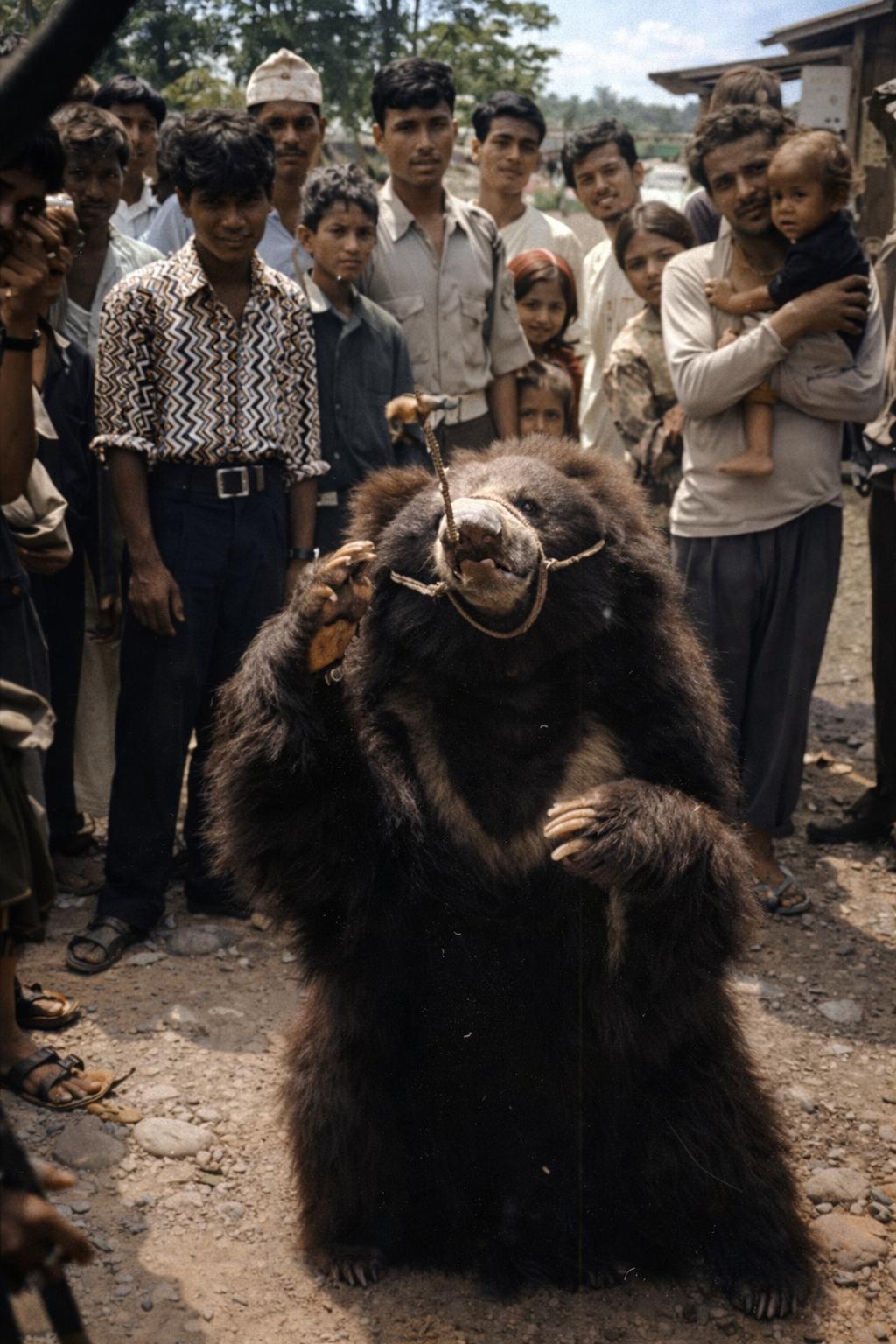 Western Nepal was completely off of the map. There were no foreigners, and the roads were barely functional. The main highway had no bridges, and our bus would have to drive through shallow sections of the river and a scout would walk across the river to check its depth. Everywhere we went locals were shocked by my presence. We encountered tribal people in colorful exotic clothes, and fascinating characters walking the streets such as the man with the giant bamboo hat in the photo below and the man with a sloth bear on a leash, which he sadly captured from the wild and travels from village to village asking for donations from curious bystanders.